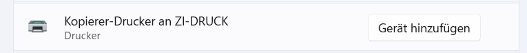 Auf Gerät hinzufügen klicken und aus der Liste Kopierer-Drucker an ZI-DRUCK auswählen und hinzufügen. Falls der Drucker nicht aufgelistet sein sollte, wenden Sie sich bitte an it@zikg.eu.